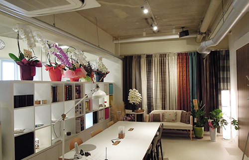 サロンに入って左手には、QUONのカラフルなイスが並べられており、最近のユーザーに好まれる多様な色使いの製品が選べるようになっている。自社だけでなくインポート製品も展示されている。自社工場を持つ強みを生かし、様々なオーダー、カスタマイズにも対応している。
