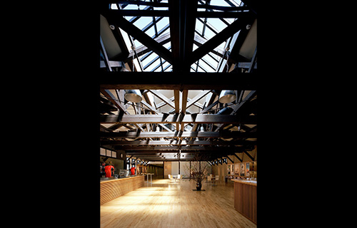 エントランスホールに入ると、屋根を支える木製三角トラスの連続が目に付く。雪の重みに耐えるためか、トラスの間隔は雪の降らない地域のものより狭いという。改修を担当した建築家の高谷時彦氏は「太さのある杉の丸太をこれだけ大量に使用したトラスは類がなく、建築的にも貴重なもの」と語る。木製のトラスが規則正しく並ぶ姿は力強さとともに暖かさも感じさせるが、2006年に工場が閉鎖されるまでは屋根裏に隠れていたという。長年にわたって建物を支えてきたトラスは、今では映画館のシンボルとなっている。