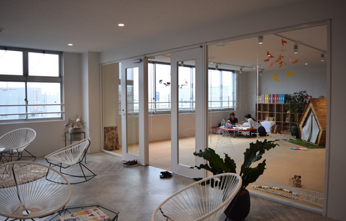 エントランスから奥へと人をいざなうように架けられた木製ブリッジは、その名も「ハートブリッヂ」。同社で展開する、障がいを持ちサポートを必要とする子どもに向けたブランドと同じ名前をつけた。ブリッジをわたったところにある「ハートブリッヂガーデン」は、サポート用品の体験やさまざまなイベントに使用できる空間。小林氏は「障がいや苦手なことがある子どもと、その家族の交流の場になればと考え、つくったスペースです。みんなの想いの架け橋になれれば」と話す。