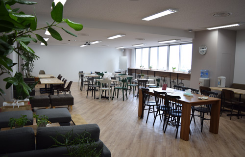 従業員用のリフレッシュルームも設けた。テーブル席やソファ席、窓辺のカウンターなど座席に変化をつけ、気分転換にも有効そうだ。