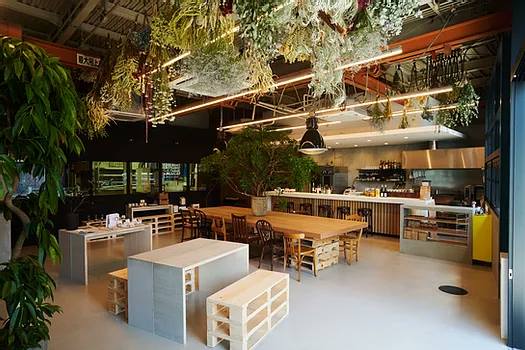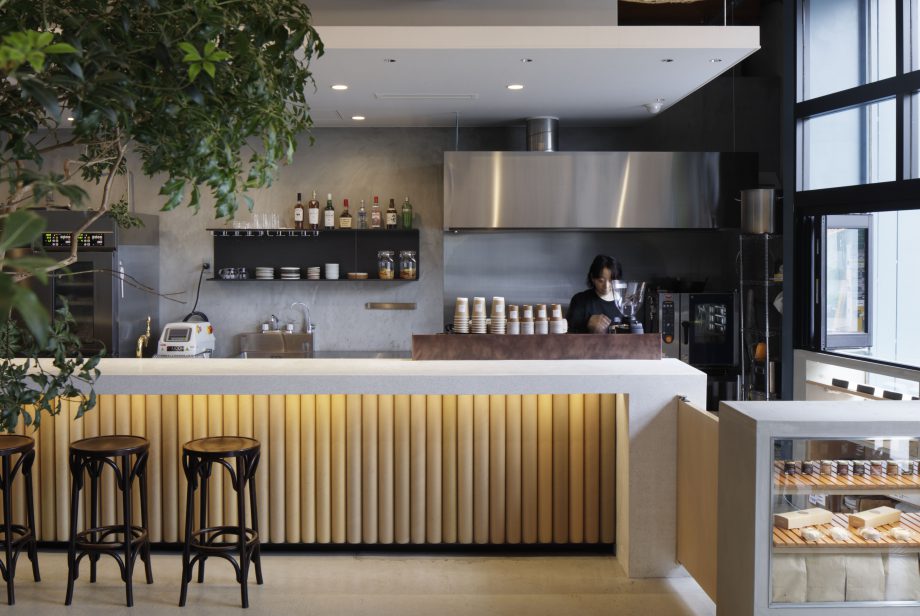 1階と2階の一部には、「KNOT MARKET PLACE」がオープンした。ベーカリーカフェとセレクトストア、ギャラリーにもなるイベントスペースからなる、施設の核となる部分だ。4mもの天井高を持つ1階のベーカリーカフェでは、店内のオーブンで焼くパンや「No Border」をテーマにした無国籍でカジュアルな料理が味わえる。鉄骨の梁の下は、「日常的でありながら非日常感が味わえる」というカフェのコンセプトを具現化した空間。工場を髣髴とさせる内装に観葉植物や木製のファニチャーが暖かみを添え、中2階のギャラリー兼イベントスペースは壁一面にイラストが描かれている。トラックが出入りしていた開口部にはテイクアウト用のカウンターが設けられ、道行く人が気軽に寄っていく。よく見ると、カフェのチェアは物流パレットのかたち。