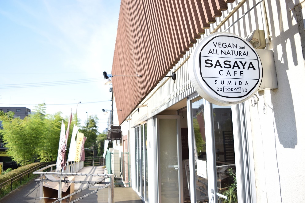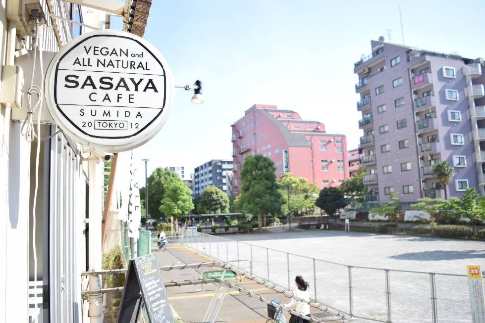 大横川親水公園に面して立つ「ささやカフェ」は、2013年のオープン。「野菜を楽しもう!」がコンセプトのオーガニックカフェで、メニューは動物性のものを一切使わないヴィーガンフードが中心。飲み物やマフィン、スコーンなどの軽食から、カレーやサンドイッチといった食事も提供している。