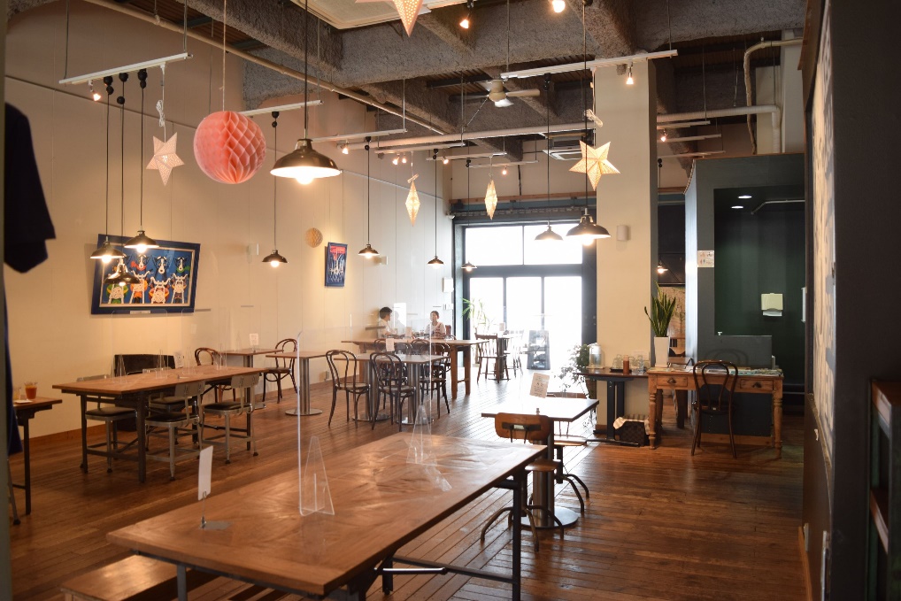 テーブルが並ぶ店内は明るく開放感があり、倉庫の雰囲気はあまり感じさせない。とはいえもとは人の滞在を前提としていない建物だ。「電気やガス、水道を引くのが大変でした」と話すのは、リノベーションを担当したアンドロッジの代表・畑山慶氏。改装にあたっては、バリアフリーも兼ねて床を50cmほどかさ上げし、配管を埋設。ガスはプロパン。トイレは独立した建物を倉庫内に建てるような構造として、飲食店への用途変更を実現した。