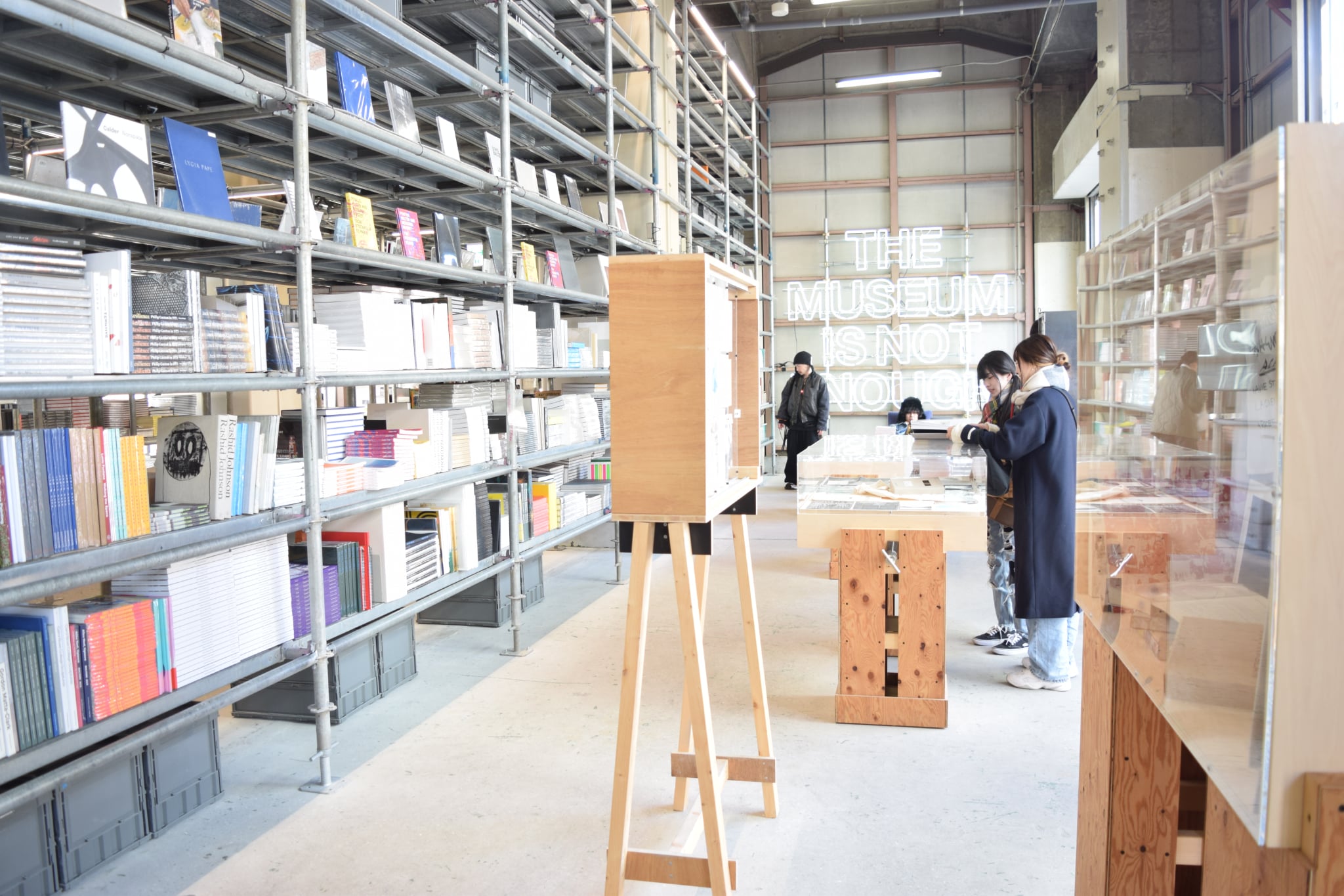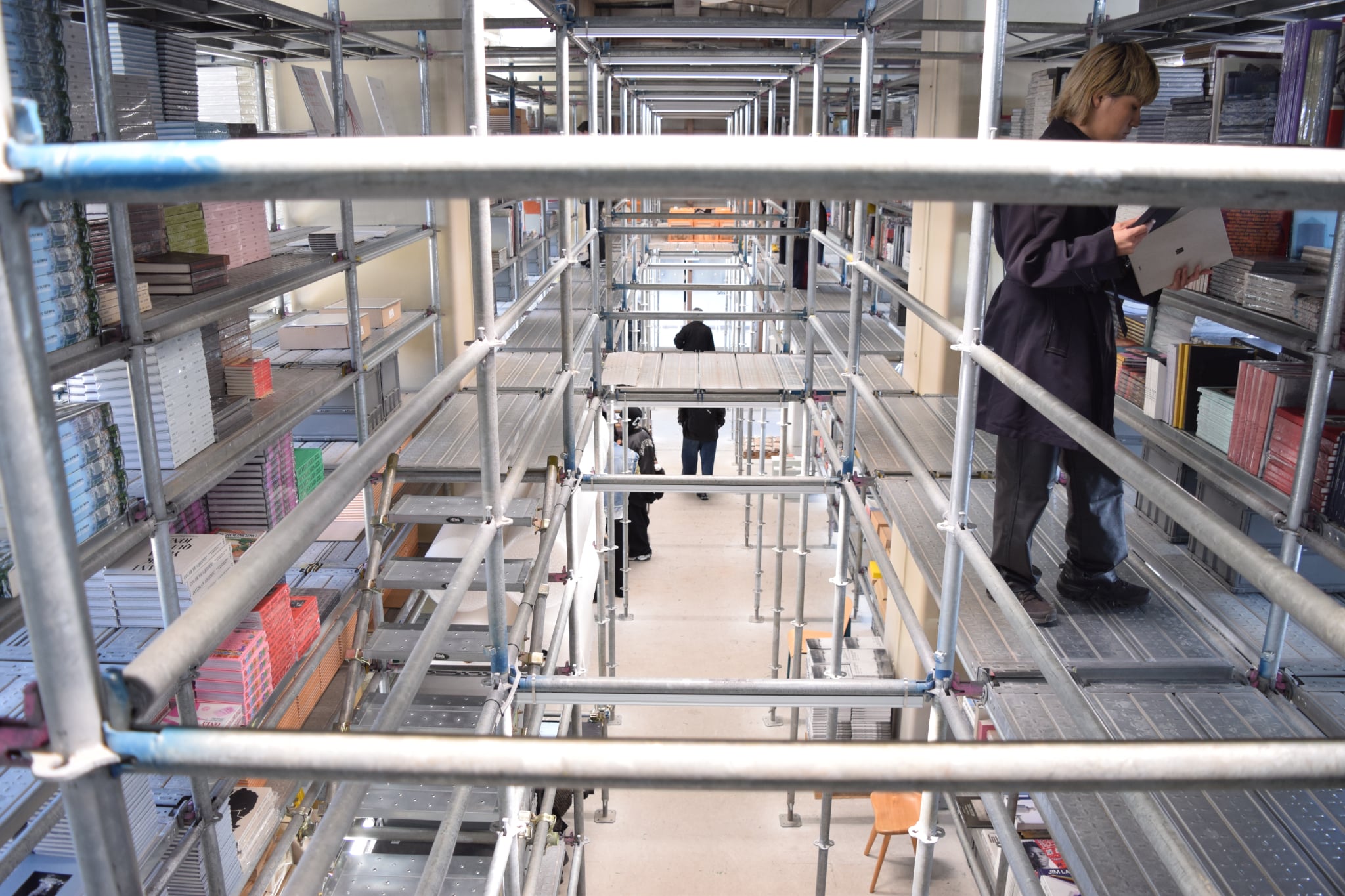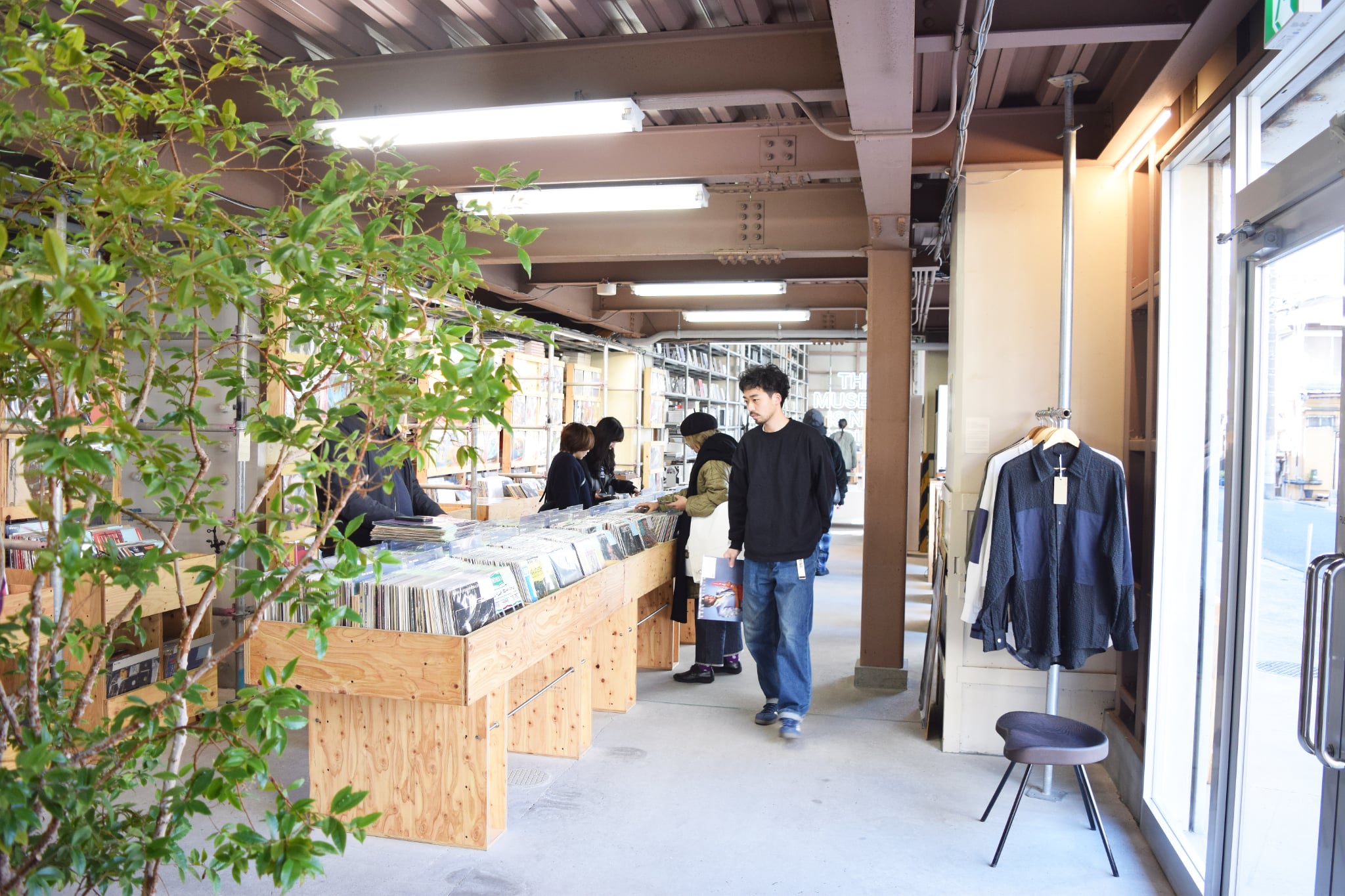 中央を縦に貫く単管の通路を進むと大量のレコードに、ついで洋書に囲まれる。これらのレコードや洋書は「VDS」と「twelvebooks」、それぞれの商品。オンラインでの販売や卸業をメインとしている2社の在庫でもあり、ここで販売もしている。平日でもレコードや本を選ぶ人の姿が見られ、その奥ではスタッフが商品の発送の手配をしている。ここは売り場でもあり、開かれた倉庫でもあるという。