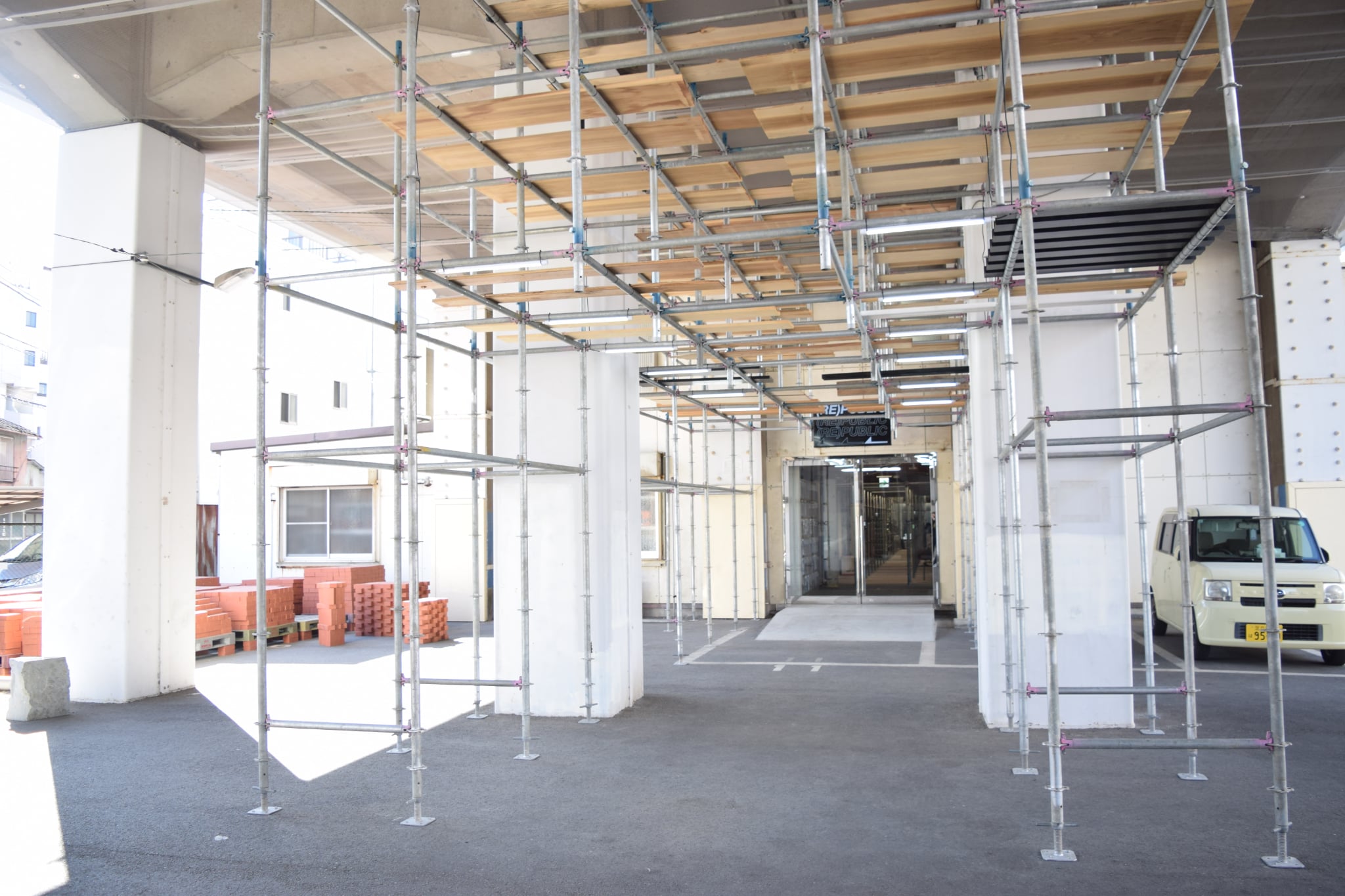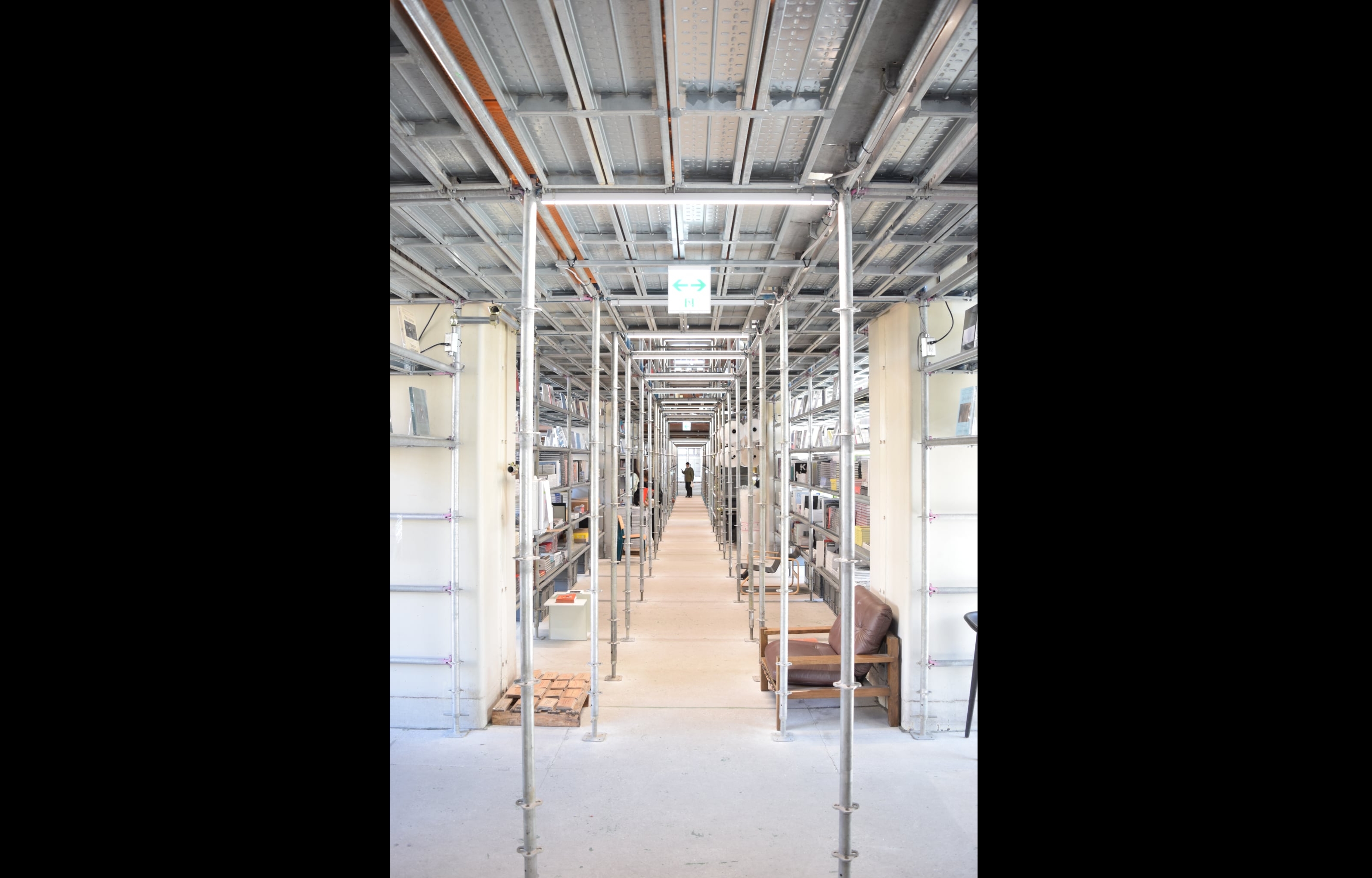 内外装ともに無機質な既存建物の現しに、天井にはさび止めが塗られた鉄骨。亀有駅側の大空間には、あるいは棚として、あるいは中2階の床として組まれた足場用の単管が整然と並び、その奥にうがたれたガラス扉から光が差し込む。むき出しの単管は硬質さこそあるものの冷たさはなく、そのピッチや意外な繊細さも相まってむしろ軽快な感じを受ける。