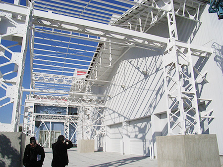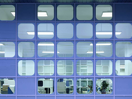 さらに、機能とデザインが一体となった耐震リニューアル工法ISGW(Interior Shear Grid Wall)も得意とする。耐震耐力不足な鉄筋コンクリート造の建物をガラスと鋼製格子のハイブリッド技術で補強する。ISGW工法は耐力不足のRC建物をガラスと鋼板で開放的に補強し、デザイン性も高く、居ながら改修工事ができ、出入り口もグリッドシステム内に設置が可能、そしてエポキシによる接着工法は低騒音、小粉塵施工となっている。