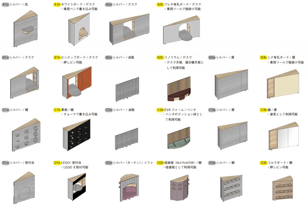 FACE to SPACEでは、11個の可動式家具を使用し、空間を自由に変化させながら間仕切りを行います。各家具には2つの壁面があり、1つは共通仕様のシルバー塗装で統一され、もう1つは異なる素材で構成された11種類の機能面です。各壁面には可動部があり、一部が机や棚などに変形する仕組みを備えています。壁面の向きや組み合わせを変え、さらに変形させることで、対面する空間に新たな意味を付加し、空間の大きさや用途に応じた柔軟な提案が可能です。