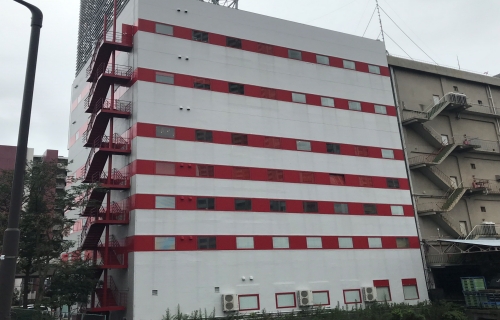 ※募集終了 芝浦IC・海岸通り、赤白ボーダーの外観の7階建て1棟倉庫